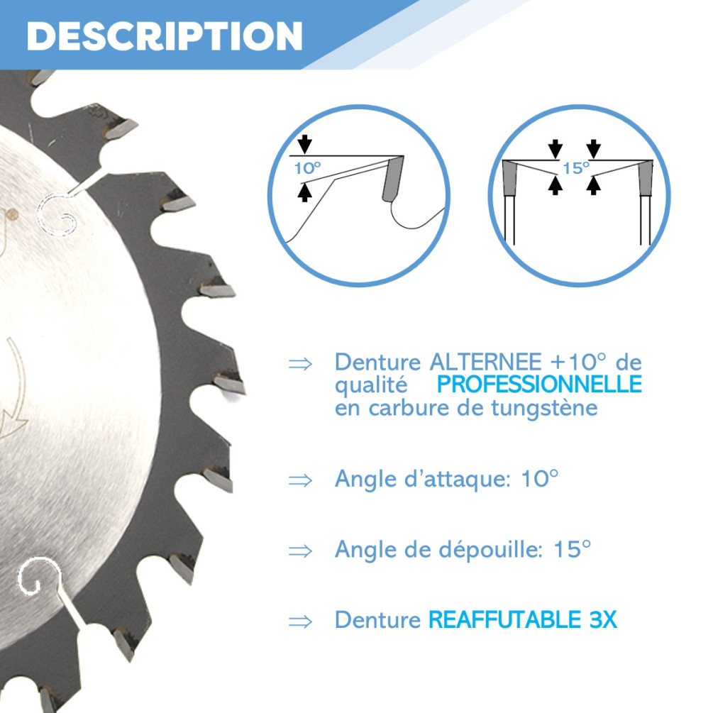 Lame de scie circulaire carbure semi-professionnelle qui convient à la coupe du bois tendre, bois exotique. Cette lame à denture alternée est souvent utilisée sur les machines de type : Scie circulaire portative. Utilisation : Débit.