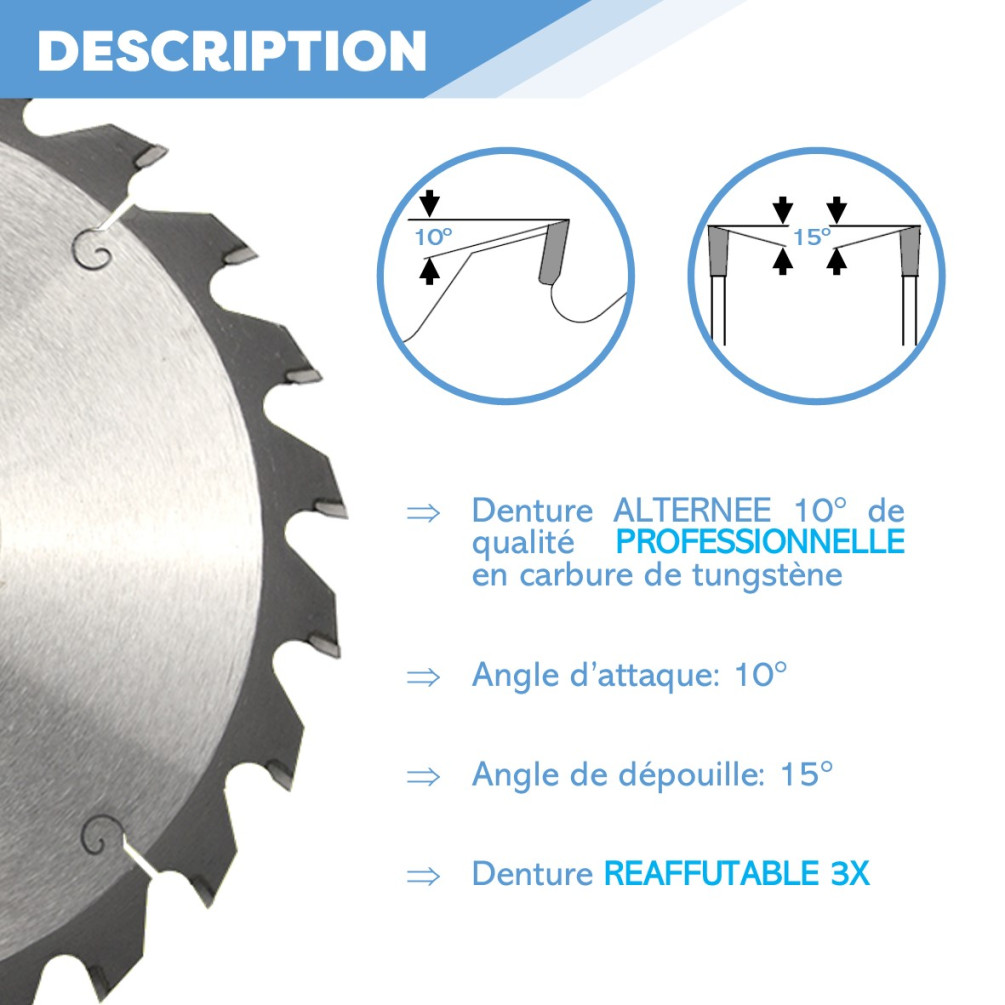 Lame de scie circulaire carbure semi-professionnelle qui convient à la coupe du bois tendre, bois exotique. Cette lame à denture alternée est souvent utilisée sur les machines de type : Scie circulaire portative. Utilisation : Débit.