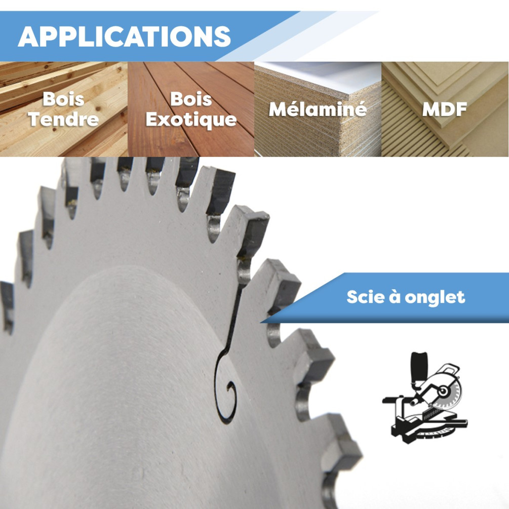 Lame de scie circulaire carbure semi-professionnelle qui convient à la coupe du bois tendre, bois exotique, des panneaux mélaminés, du MDF. Cette lame à denture alternée est souvent utilisée sur les machines de type : Scie à onglet. Utilisation : Universelle - Finition.