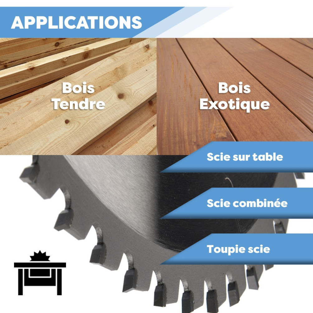 Lame de scie circulaire carbure semi-professionnelle qui convient à la coupe du bois tendre, bois exotique. Cette lame à denture alternée est souvent utilisée sur les machines de type : Scie sur table, combinée, toupie scie (LUREM, ROBLAND, KITY, SCHEPPACH, HOLZPROFI, JEAN L'EBENISTE, FOX, LEMAN, HOLZMANN, BERNARDO, etc). Utilisation : Universelle.