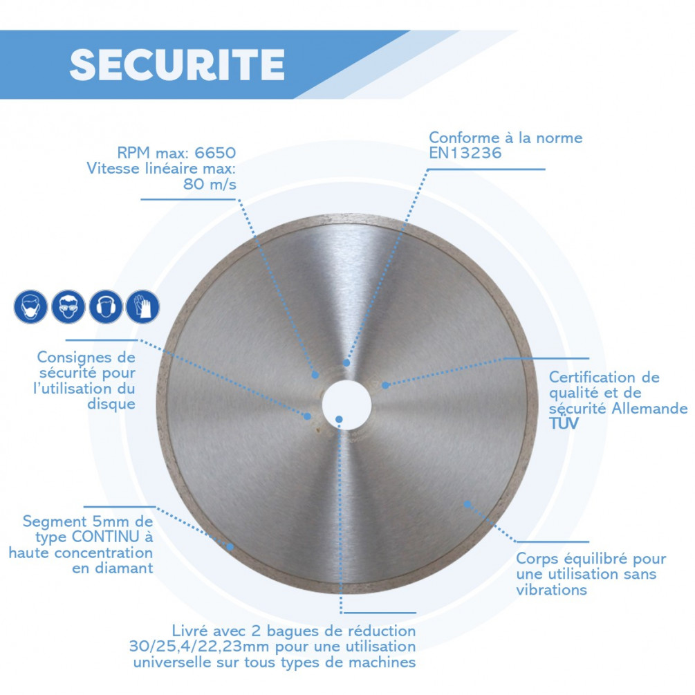 Disque diamant segments jante continue. Coupe possible à sec ou à eau. Convient pour machine : Meuleuse / Disqueuse / Coupe carreaux électrique / Scie sur table. Utilisation : carrelage, faïence. Utilisateurs : Carreleurs, et autres métiers du BTP.