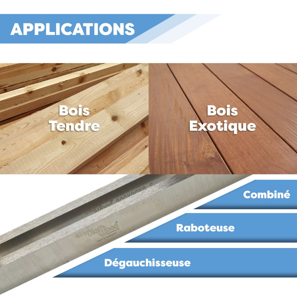 Pour utilisation sur machines à bois de type raboteuse, dégauchisseuse, ou combiné (LUREM, ROBLAND, KITY, SCHEPPACH, HOLZPROFI, JEAN L'EBENISTE, FOX, LEMAN, HOLZMANN, BERNARDO, etc).