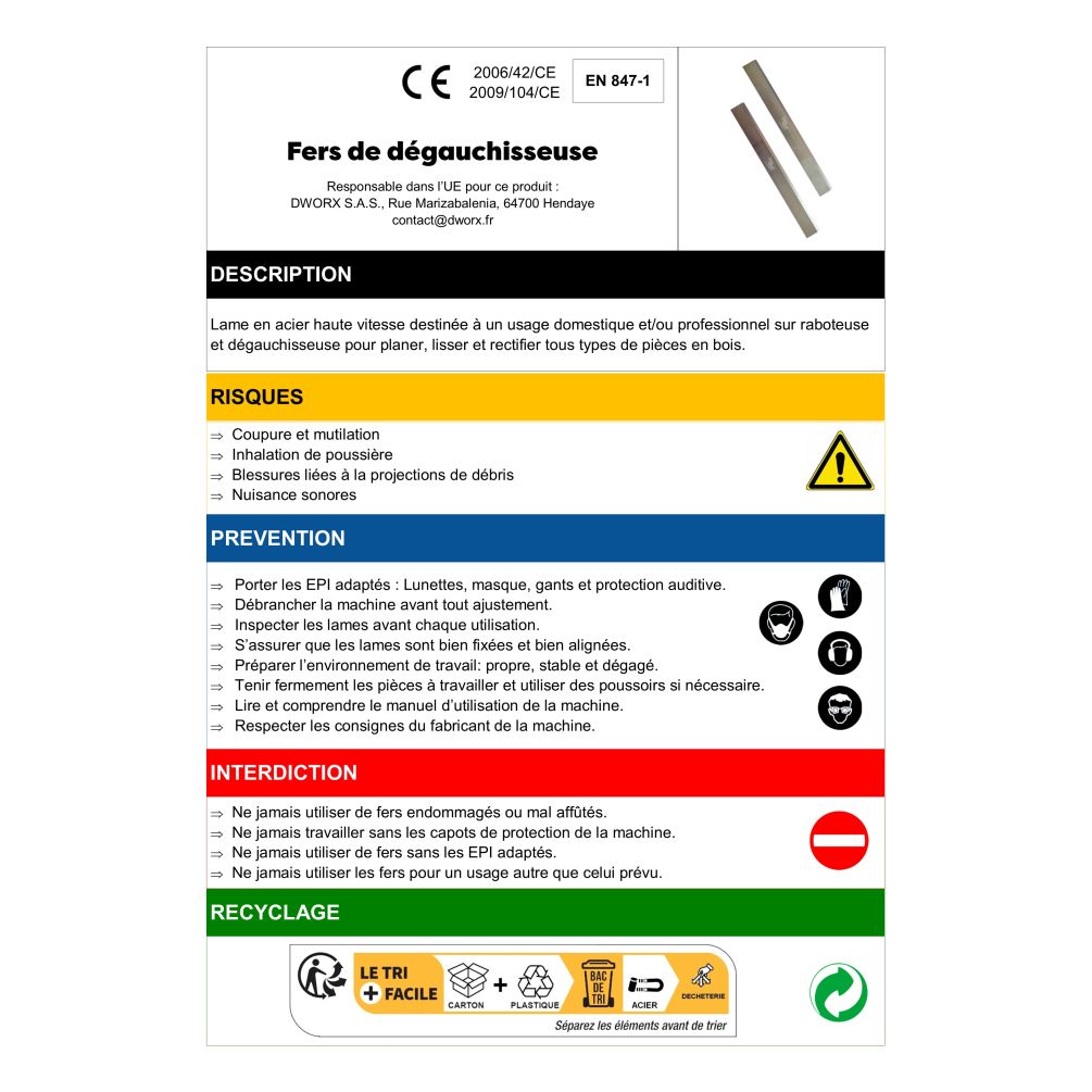 | AVERTISSEMENT et SECURITE | Avertissement et Informations de Sécurité Avertissement de sécurité : Ce produit est destiné à un usage professionnel ou domestique. Veuillez suivre les instructions ci-dessous pour garantir une utilisation sûre : Utilisation appropriée : Utilisez cet outil uniquement conformément aux instructions fournies. Ne pas utiliser cet outil pour des applications non prévues. Précautions générales : Toujours porter des équipements de protection individuelle (gants, lunettes de sécurité, protection auditive). Assurez-vous que la zone de travail est propre et dégagée. Ne pas utiliser l'outil près de l'eau ou dans des conditions humides. Manipulation et stockage : Conservez l'outil hors de portée des enfants. Rangez l'outil dans un endroit sec et sécurisé lorsque vous ne l'utilisez pas. Vérifiez régulièrement l'état de l'outil. En cas de dommages, retirez-le immédiatement de l'utilisation. Avertissement de risques : Cet outil peut présenter des risques de coupure, d'écrasement ou d'autres blessures. En cas de blessure, consultez un médecin immédiatement. Recyclage et élimination : Respectez les réglementations locales pour l'élimination de ce produit Personne responsable dans l’UE pour nos produits : DWORX Rue Marizabalenia, 64700 Hendaye Email : contact@dworx.fr |