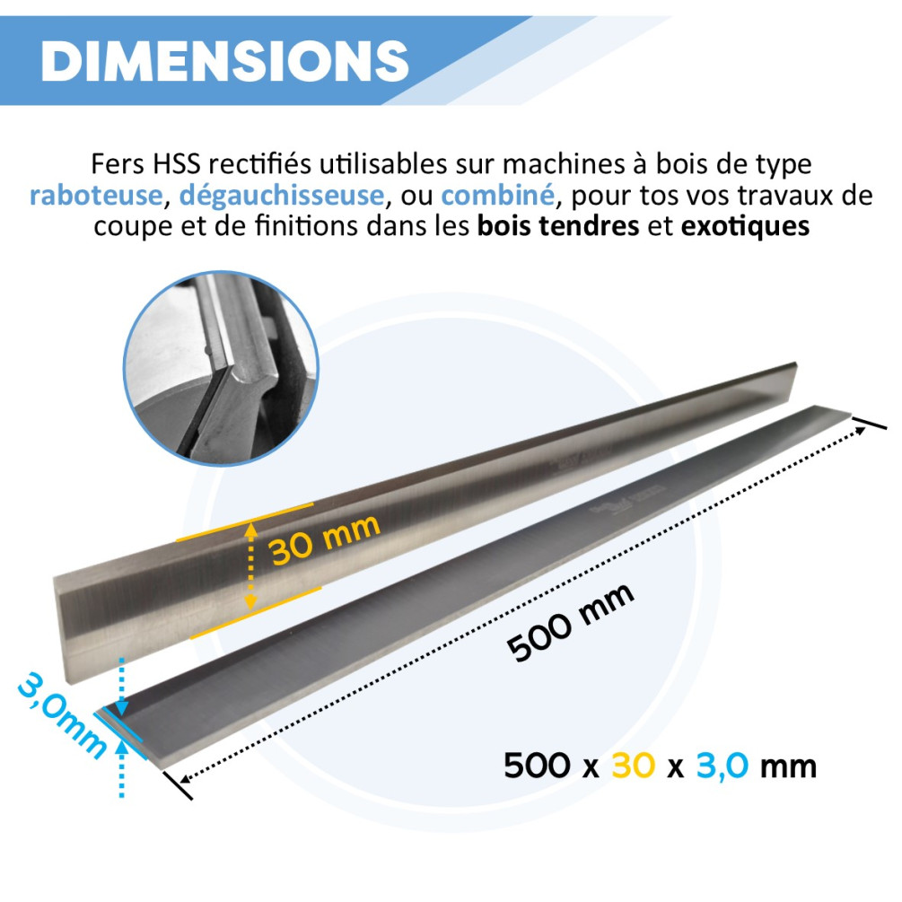 Caractéristiques du fer de dégauchisseuse/raboteuse 500 x 30 x 3 mm acier HSS