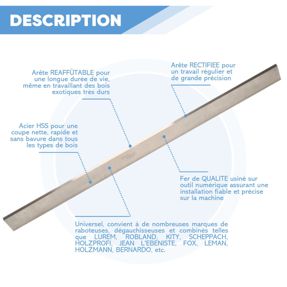 Caractéristiques du fer de dégauchisseuse/raboteuse 630 x 30 x 3 mm acier HSS