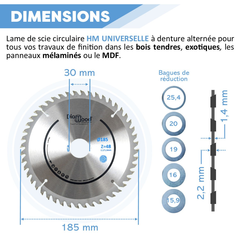 Caractéristiques techniques de la lame de scie circulaire portative HM universelle D. 185 mm Diamwood