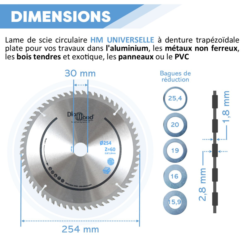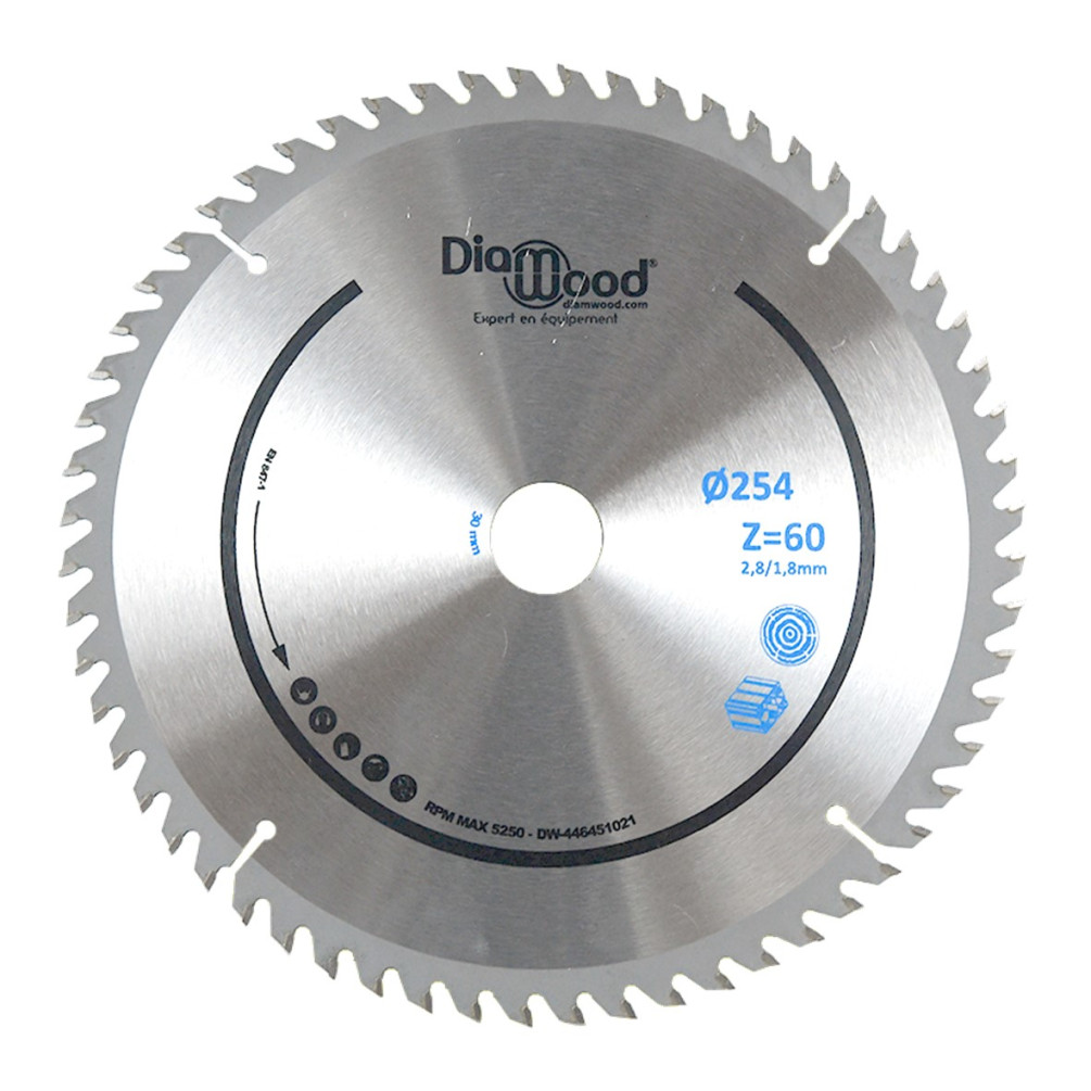 Lame de scie circulaire HM universelle D. 254 x Al. 30 x ép. 2,8/1,8 mm x Z60 TP Nég pour Alu/bois - Diamwood