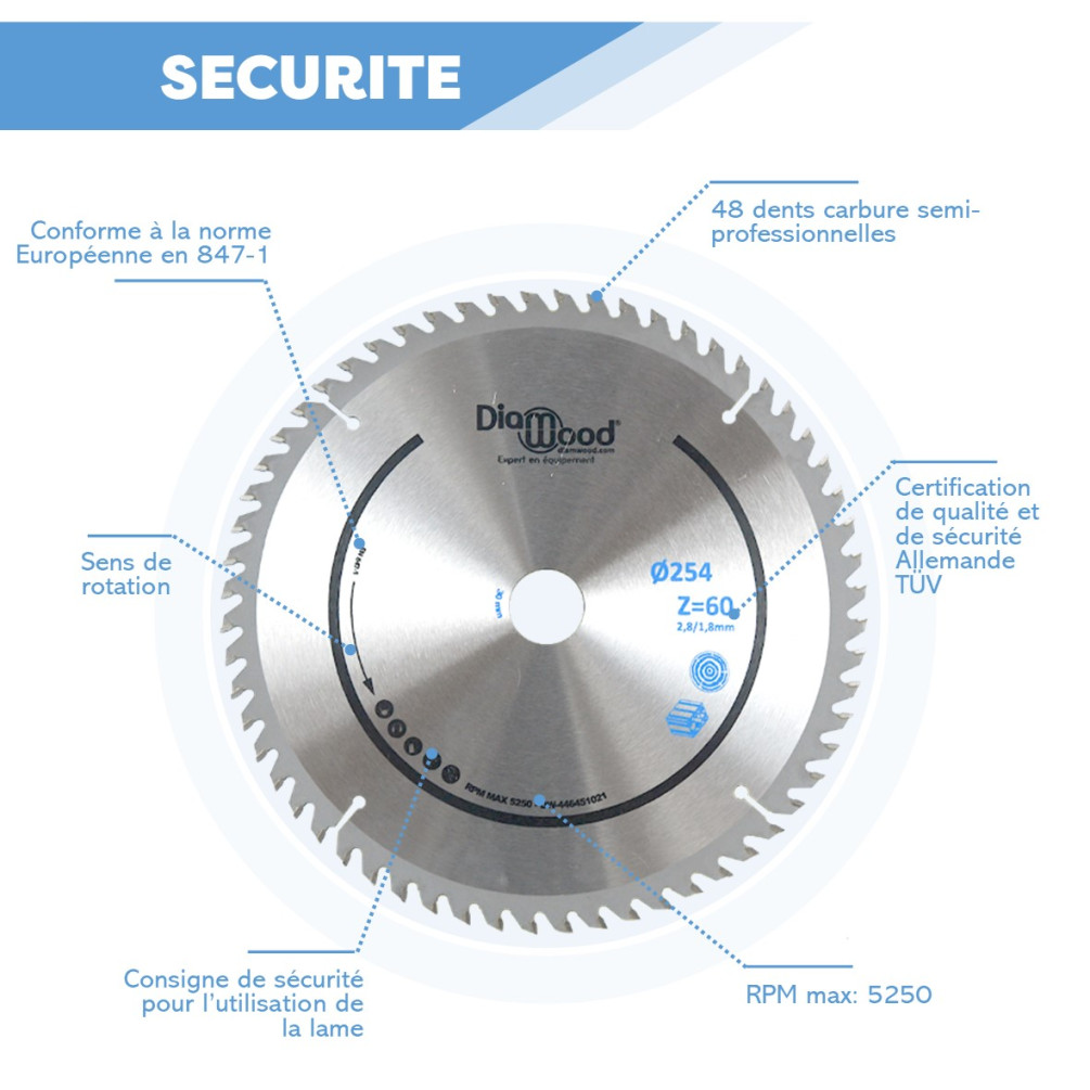 Caractéristiques techniques de la lame de scie circulaire HM universelle D. 254 mm Diamwood