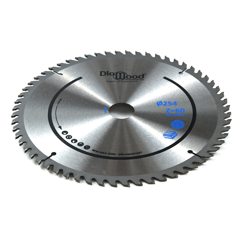Ref. DW-446451021En savoir + sur Lame de scie circulaire HM universelle D. 254 x Al. 30 x ép. 2,8/1,8 mm x Z60 TP Nég pour Alu/bois - Diamwood