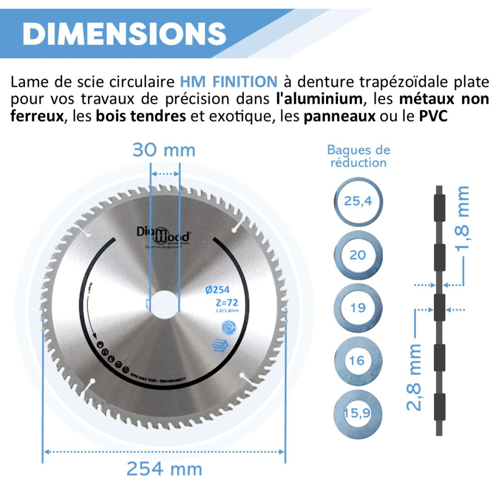 Caractéristiques techniques de la lame de scie circulaire HM finition D. 254 mm Diamwood