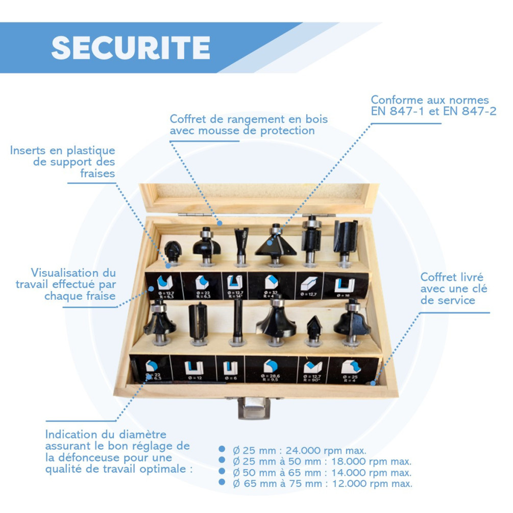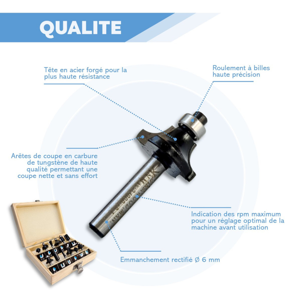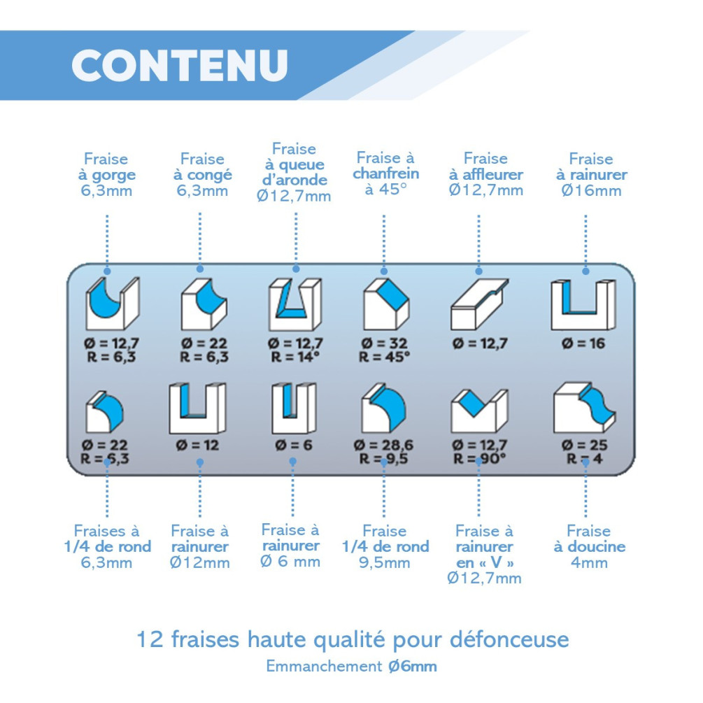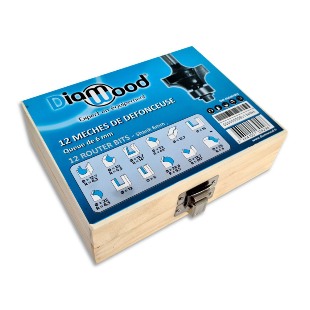Coffret assortiment de 12 mèches de défonceuse carbure Q. 6 mm pour bois, panneaux - Diamwood